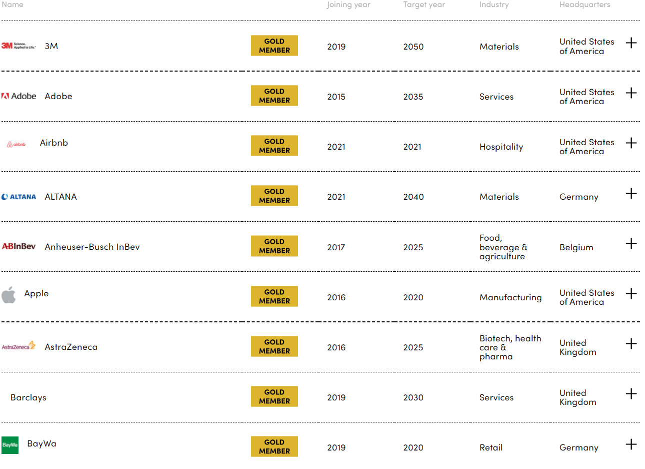 다국적 비영리 기구 The Climate Group에서 시작하여 Google, 3M, ESTEE LAUDER, novo nordisk 등 세계적인 기업들이 가입되어 있으며 국내에서는 SK그룹 8개사가 20220년 12월 처음으로 가입하였다.