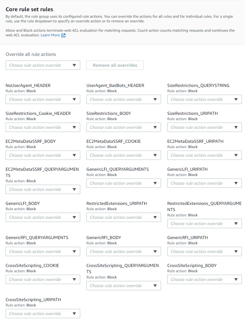 작년에만 해도 AWS Managed Rule set에서 세세하게 Rule 기준으로 예외처리를 할 수 있는 기능이 없었는데 최근에 보니 Rule set 내에 상세 카테코리가 생긴것을 확인하였습니다.
