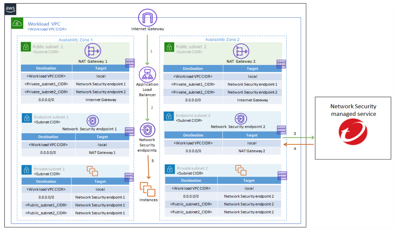 GWLB + TrendMicro Network Security IPS 개념도 아래의 구성은 인바운드 트래픽에 대한 흐름만 표현하고 있지만, EC2에서 아웃바운드 라우팅이 Network Security Endpoint로 지정되어 있어 아웃바운드 트래픽에 대한 검사가 IPS를 통해 이루어진 후에 NAT Gateway를 통해 통신이 이루어 지도록 되어있다.
