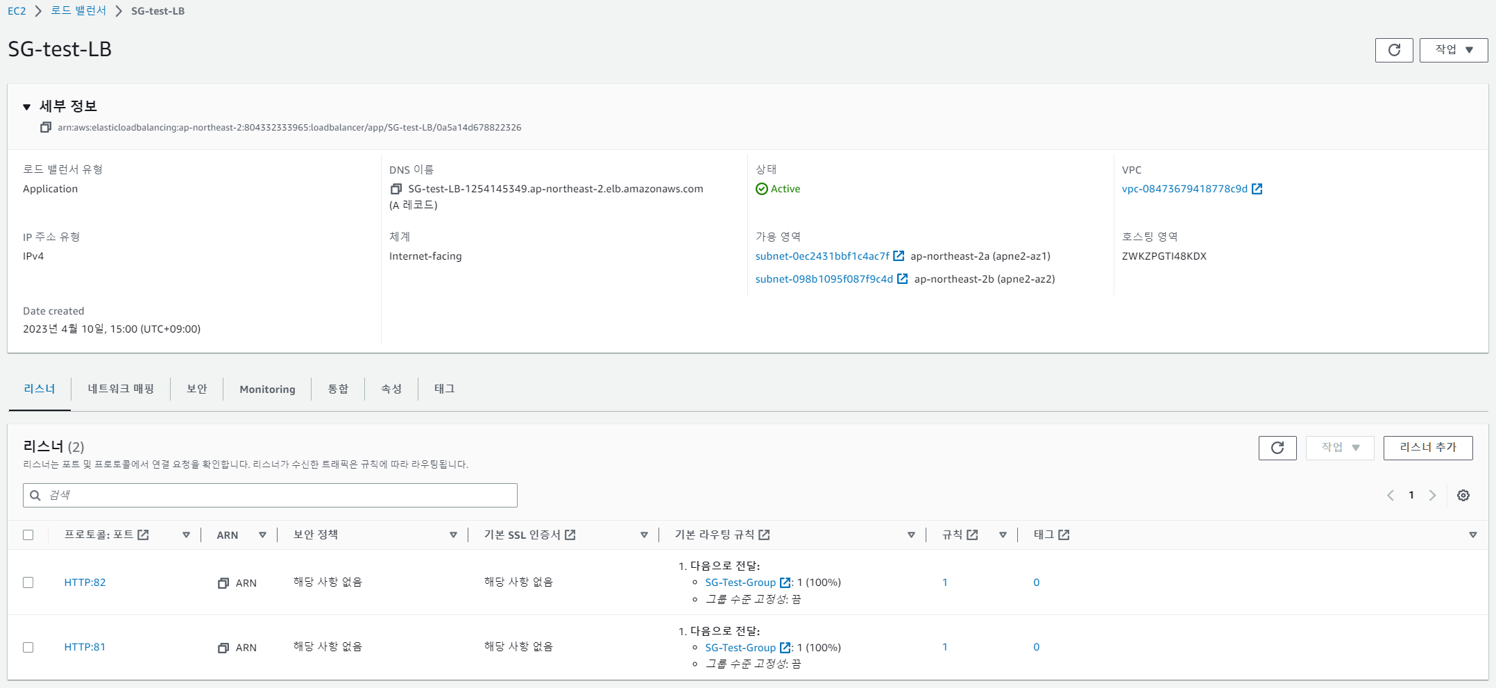테스트 로드밸런서 로드 밸런서의 보안 그룹은 2개 지정되어 있고