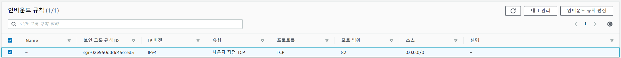 Test Rule 2 (82 port) EC2의 보안 그룹은 TestRule (81 port)의 보안 그룹 규칙 ID (sg-0a3d2e...)를 소스로 구성하였다.