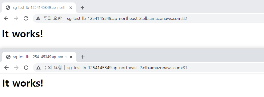 Test Rule (EC2) 81, 82 port 모두 It works!로 정상 동작함을 확인할 수 있다.