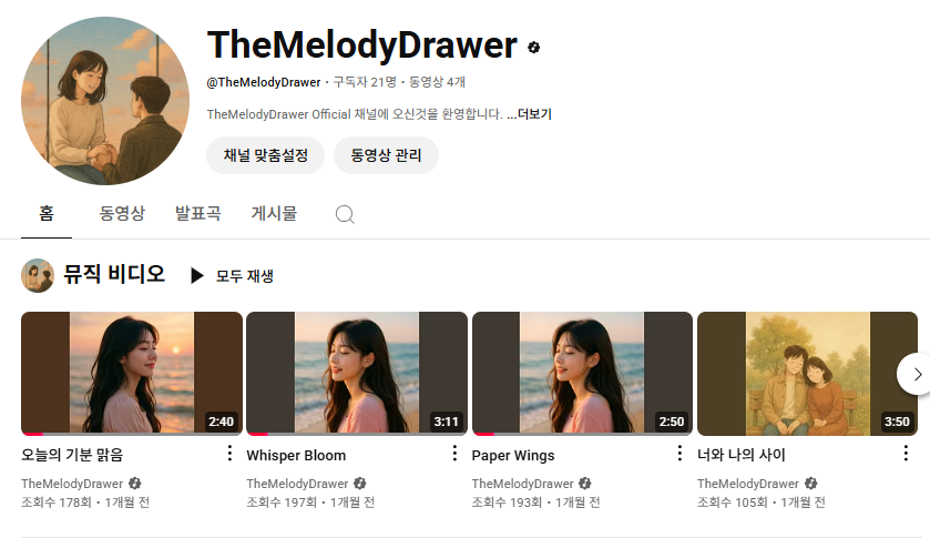 제 곡이 궁금하시면 언제든지 제 채널에 들으러 오세요. 현재 순수 구독자가 21명입니다!